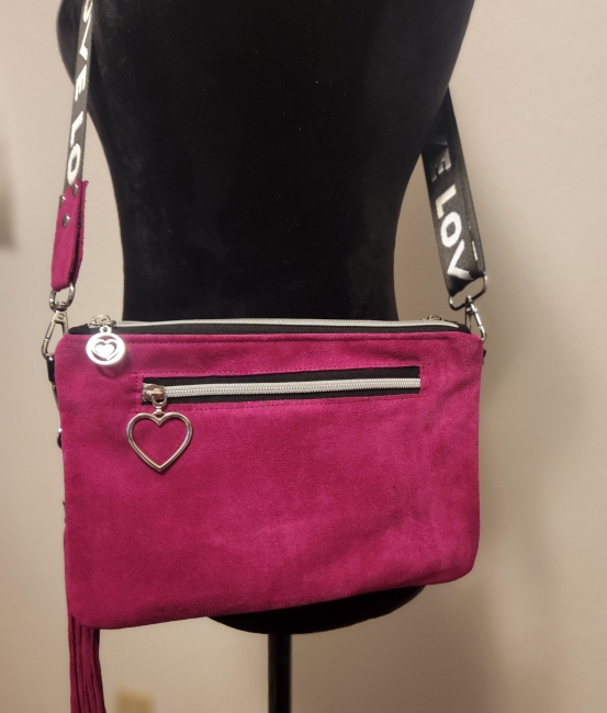 Bold fuschia in genuine cow suede, stunning hardware, color coordinated shoulder strap, to coordinating lining colors, makes this a must have Texas handmade purse.