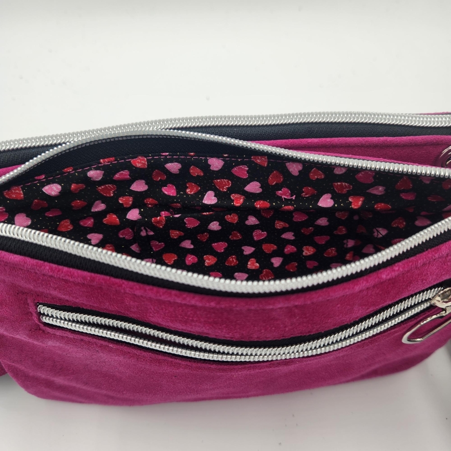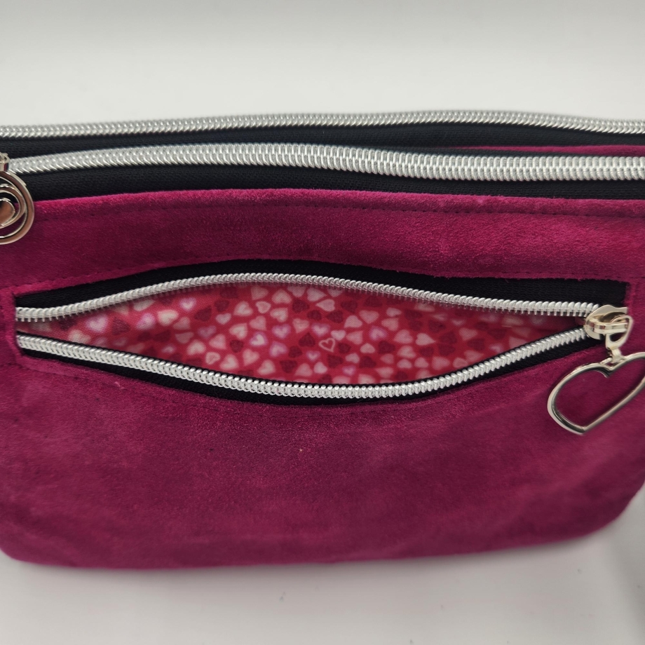 This suede handmade purse has 2 separate zippered purse openings which combines two worlds of cross-body and clutch, which give plenty of room.