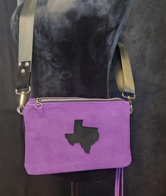 Purple genuine cow suede, purple zipper, shimmer purple accent, color coordinated lining color, makes this a must have Texas handmade purse.