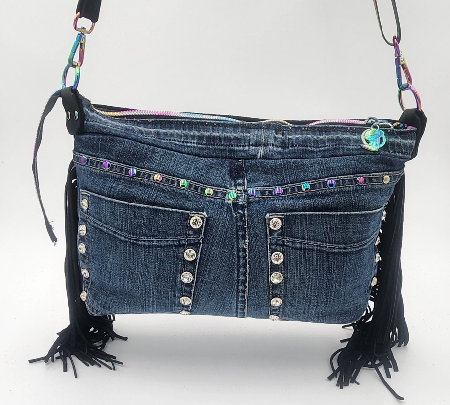 The perfect combination of western chic. Side 1 has orginal denim pockets and side 2 is suede with multiple zipper pockets..Check out cowboy boot top zipper pulls...Belted waistband, fringe, inside zipper pocket lined with western fabric to give your purse the perfect country chic look.
