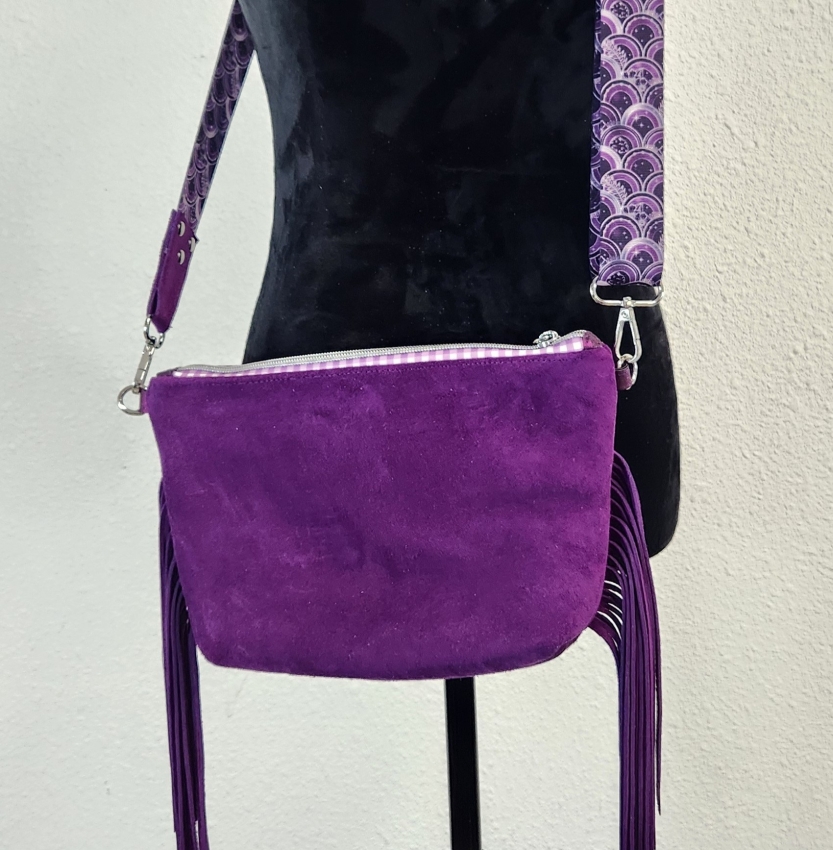 Dark purple rich color in genuine cow suede, stunning hardware, color coordinated shoulder strap, to vivid color coordinating inside lining, makes this a must have Texas handbag.
