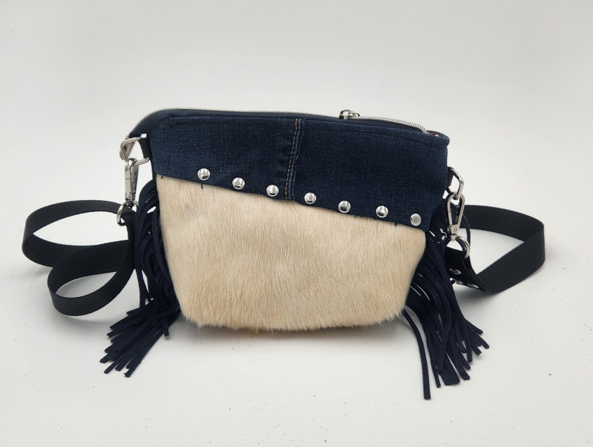 Made with cow hair hide combined with repurposed jeans makes an adorable purse.