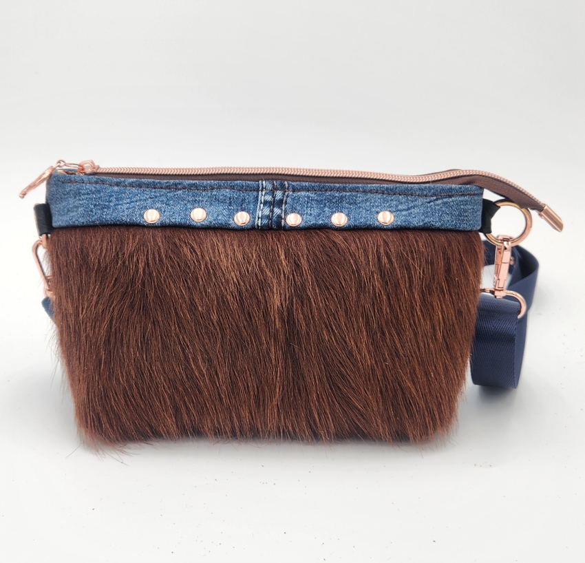 Made with cow hair hide combined with repurposed jeans makes an adorable purse.