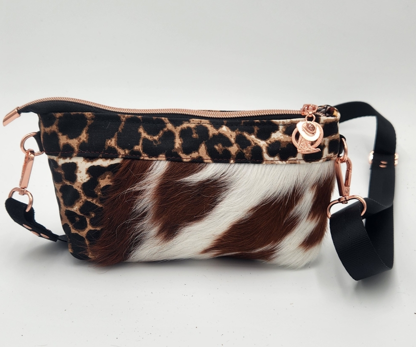 Made with stunning cow hair hide combined with animal print fabric makes an adorable purse.