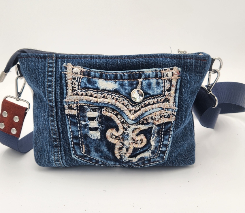 It has full zipper top closure, fully lined , eye catching hardware, and bling denim slip pocket for their phone.