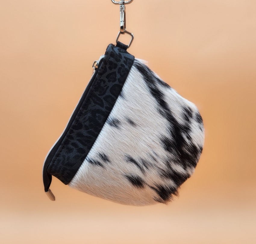 Gorgeous silky soft genuine cowhair with animal print plus stunning hardware, color coordinated wrist strap, color and design coordinating inside lining and western zipper pull, makes this an adorable head a turning Texas bag. Holds phone and few other small items.