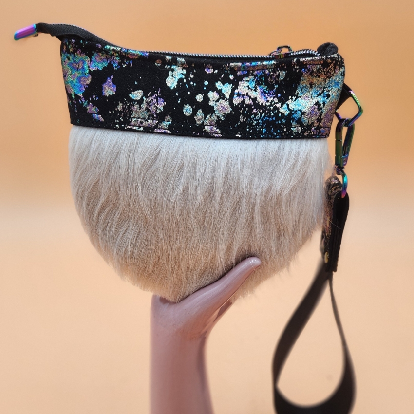 Gorgeous silky soft genuine cowhair with rainbow spatter on black suede plus stunning hardware, color coordinated wrist strap, color and design coordinating inside lining and surprise zipper pull, makes this an adorable head turning Texas bag. Holds phone and few other small items.