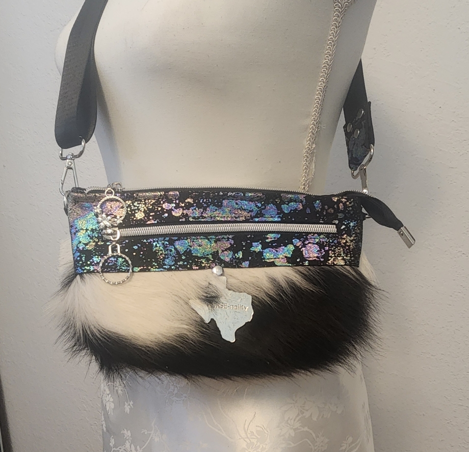 Gorgeous multicolor suede with white genuine cow hair with stunning hardware, color coordinated shoulder strap, color and design coordinating inside lining and zipper pulls, makes this adorable head a turning Texas handbag.