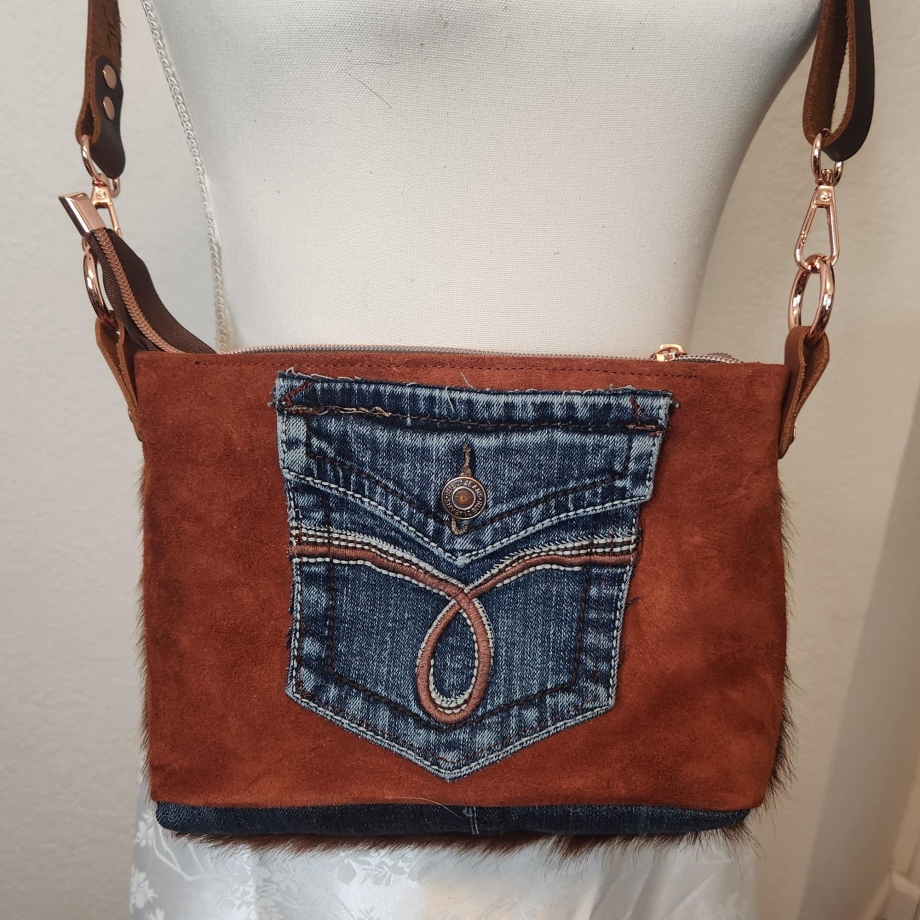 Rich brown color in genuine cow suede and cow hair with denim back pocket, cutest cowgirl zipper pulls, color coordinated shoulder strap, to color coordinating inside lining, makes this adorable Texas handbag.