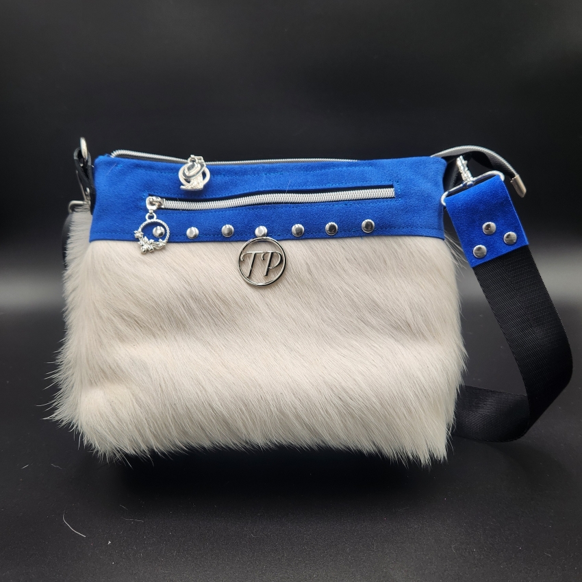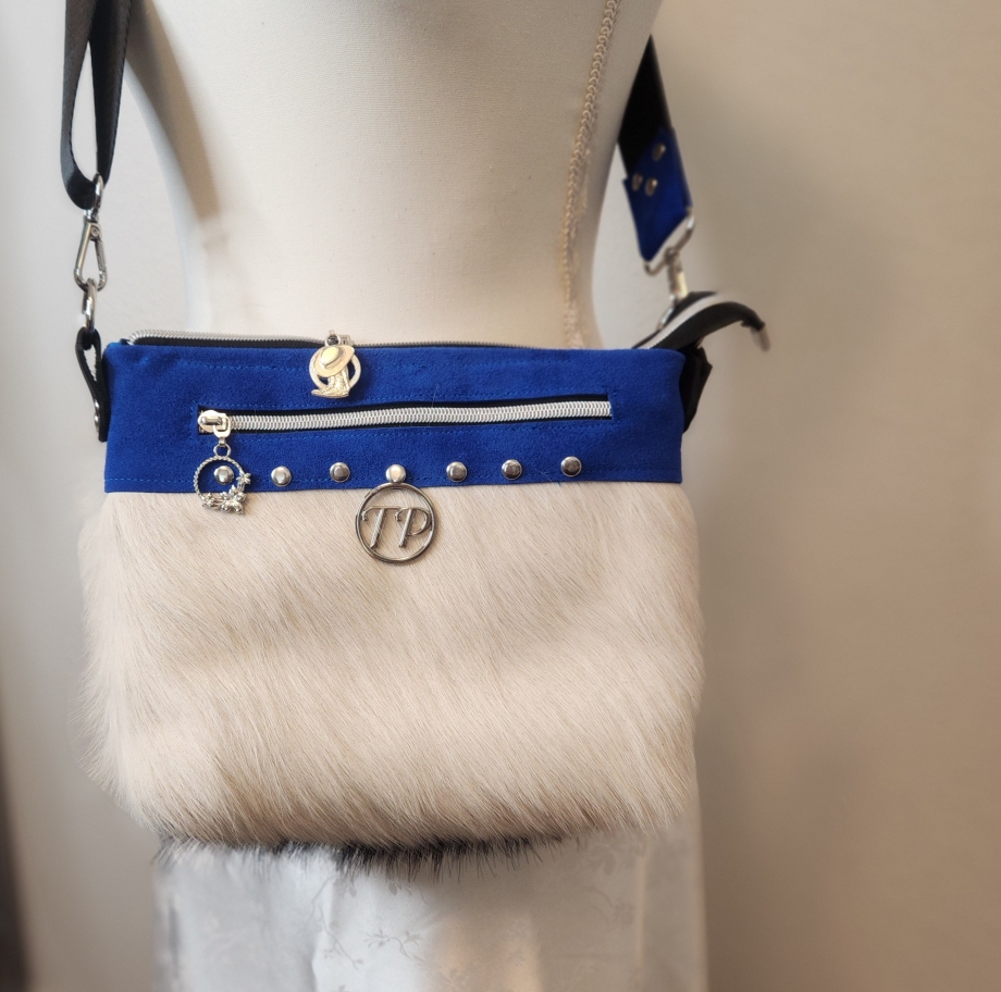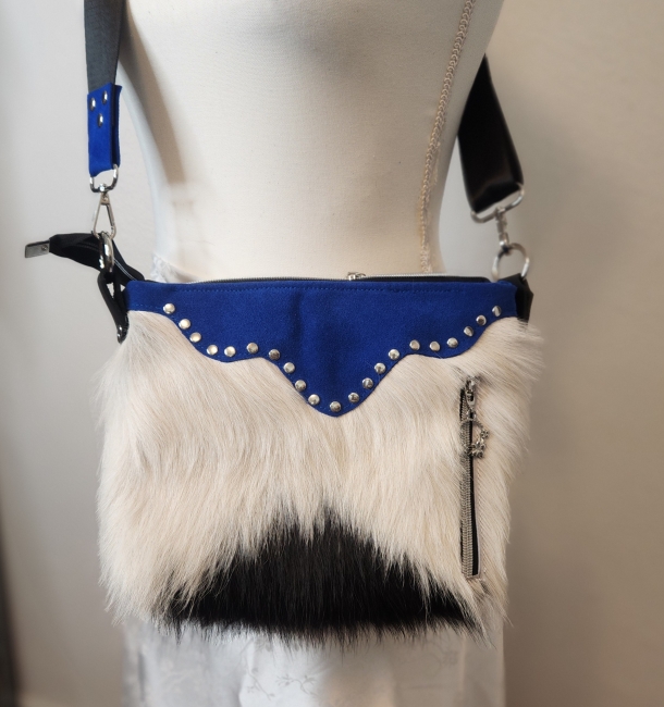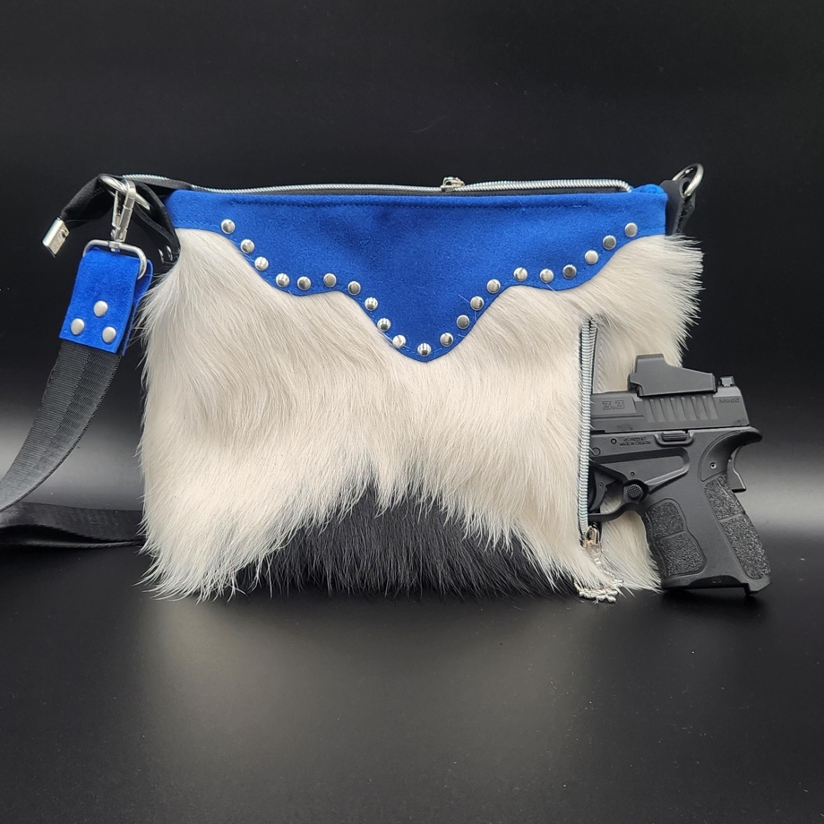 Gorgeous royal blue suede with white genuine cow hair with stunning hardware, color coordinated shoulder strap, color and design coordinating inside lining and zipper pulls, makes this adorable head a turning Texas handbag.