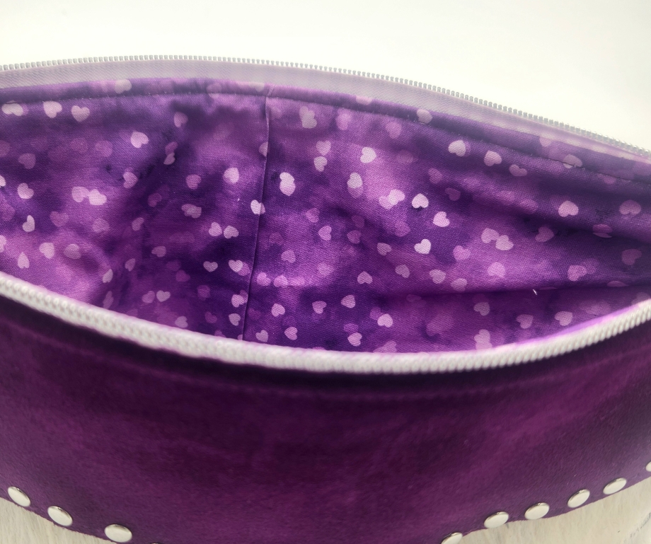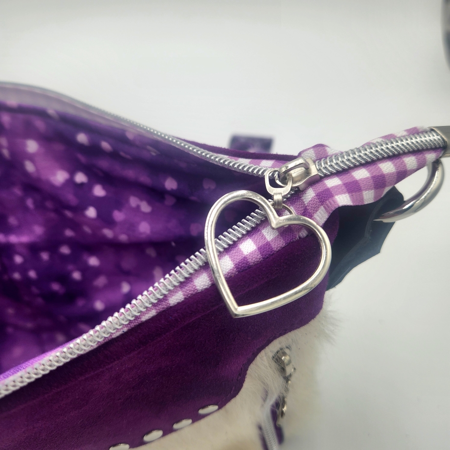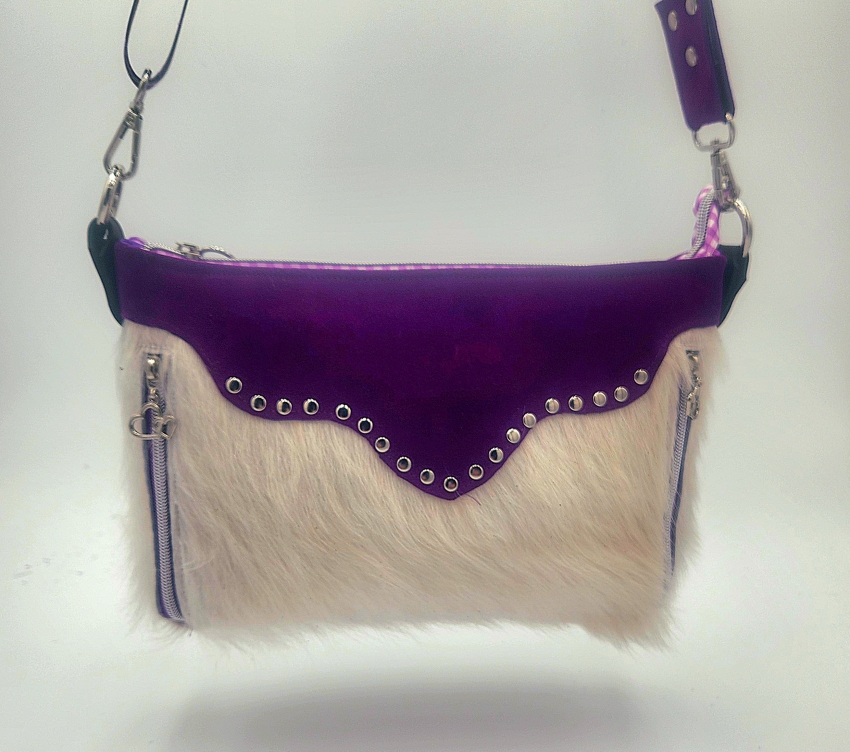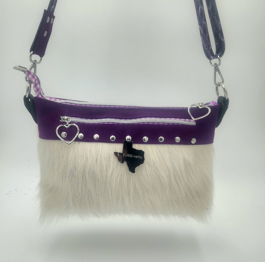 Gorgeous purple suede with white genuine cow hair with stunning hardware, color coordinating lining and zipper pulls. This unique Texas purse is a head a turner.